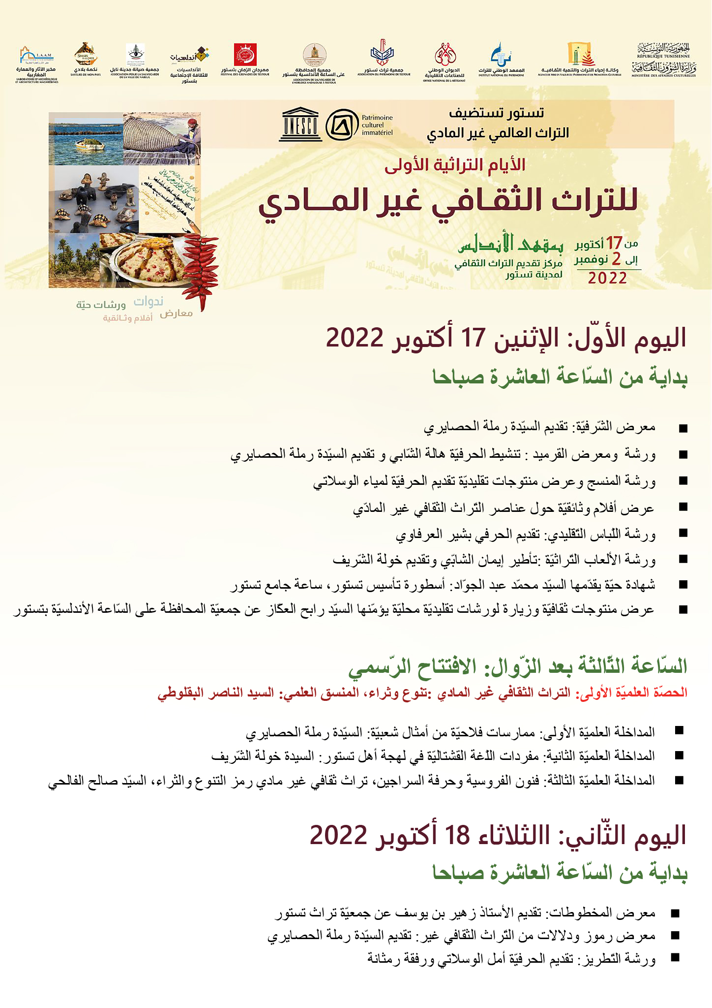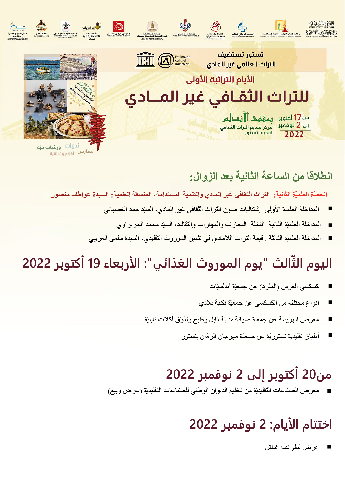 في إطار الاستعداد للاحتفاء بالذكرى العشرين لاعتماد منظمة الأمم المتحدة للتربية والعلم والثقافة اليونسكو اتفاقية صون التراث الثقافي غير المادي في 17 أكتوبر 2003 ، تنظّم وكالة إحياء التراث والتنمية الثقافية بالتعاون مع المعهد الوطني للتراث والديوان الوطني للصناعات التقليدية وجمعية تراث تستور وجمعية المحافظة على الساعة الأندلسية بتستور ومهرجان الرمان بتستور وجمعية الأندلسيات للثقافة الاجتماعية بتستور وجمعية صيانة مدينة نابل وجمعية نكهة بلادي ومخبر الآثار والعمارة المغاربية، الأيام التّــراثية الأولى للتراث الثقافي غير المادي من 17 أكتوبر إلى 2 نوفمبر 2022 بمركز تقديم التراث الثقافي بمدينة تستور: مقهى الأندلس.