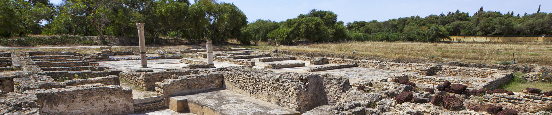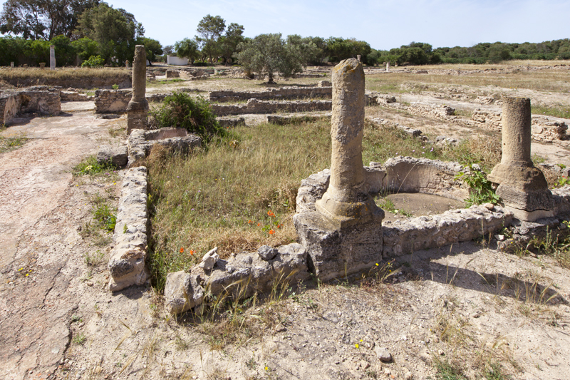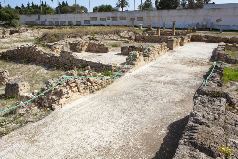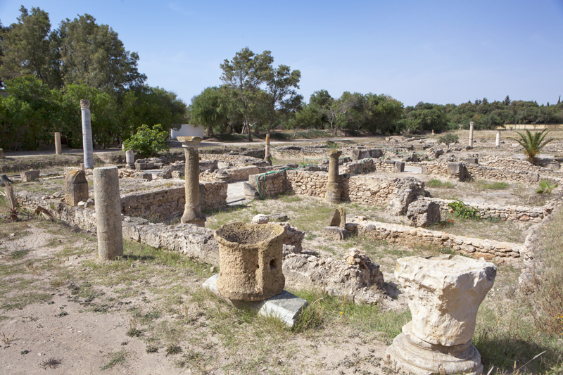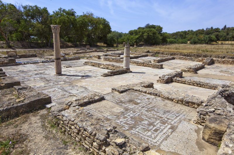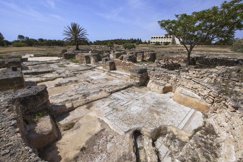 - قاعة الفناء المعمد االمزخرف بصور (القرنان الرابع والخامس) والذي استُمد تسميته من لوحة الفسيفساء التي تعيد إنتاج الظل الذي تلقيه أعمدة الرواق المحيط بها على الأرض. ومن بين عناصرالزينة فسيفساء وسط الفناء تجسد منارة تشع نورا،تيمّنابها لرحلات بحرية نهايتها سعيدة. ويؤدي الركن الشمالي الشرقي من الفناء إلى حمام  خاص صغير.
