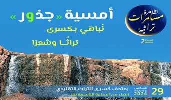 احتفاءً بشهر رمضان المعظّم وفي إطار الأنشطة والتّظاهرات الثّقافية المبرمجة تزامنا مع هذه المناسبة الدينية، تنظّم وكالة إحياء التّراث والتنمية الثقافيّة بالشراكة مع المعهد الوطني للتّراث "مسامرات تراثيّة" تحمل عنوان " جذور " نباهي بكسرى تراثا وشعرا وذلك يوم الإثنين 29 مارس 2024 بمتحف كسرى للتراث التقليدي ابتداء من السّاعة التاسعة ليلا.