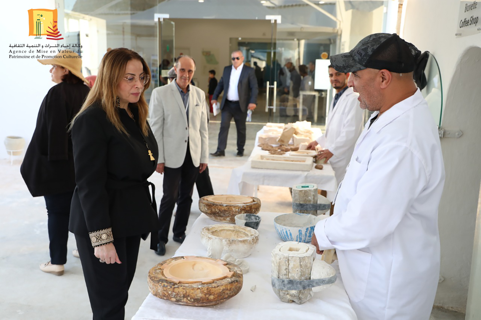 واطلعت السّيدة المديرة العامّة في زيارتها على ورشات القولبة والخزف التي يؤمنها حرفيون مختصون من وكالة إحياء التراث والتنمية الثقافية وورشة للفسيفساء التي تشرف السيدة سميرة عروس. وتعرفت على المعرض الوثائقي"Patrimoines Connectés" وهو معرض يقدم تاريخ جزيرة جربة وأهم معالمها وخصوصياتها المعمارية. وزارت معرض النّسيج الجربي عبر التعبيرات الفنية المشترك لعدد من الفنّانين التّشكيليين هم كل من الطيّب زيود ومحمد خامس المصراطي وماريا بن سلامة وYuften في عرض يجمع بين لوحات فسيفسائية وتشكيلية والقماش المستعمل في الألبسة الجربية.