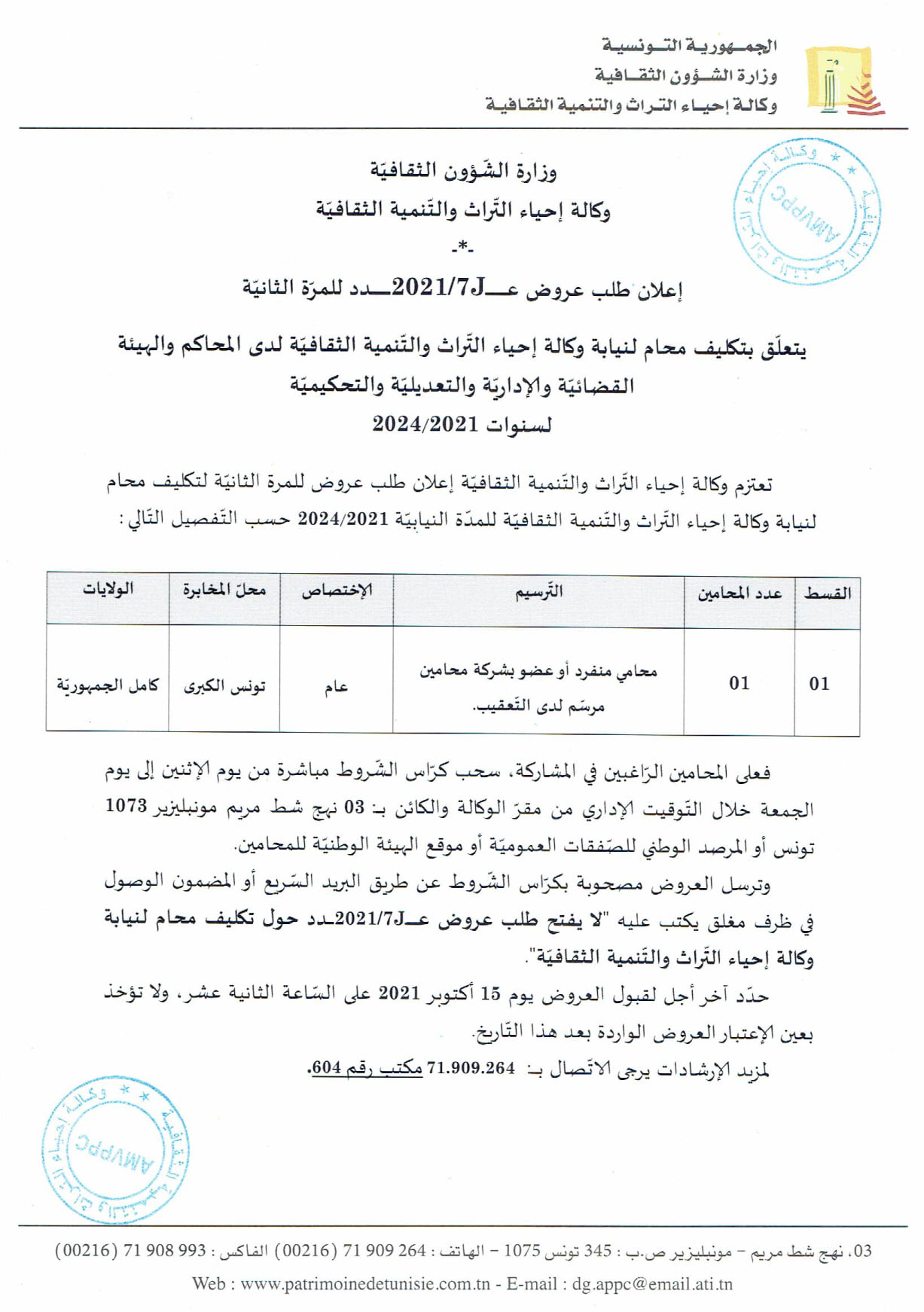 يتعلّق بتكليف محام لنيابة وكالة إحياء التّراث والتّنمية الثقافيّة لدى المحاكم والهيئة القضائيّة والإداريّة والتعديليّة والتحكيميّة لسنوات 2021 / 2024
