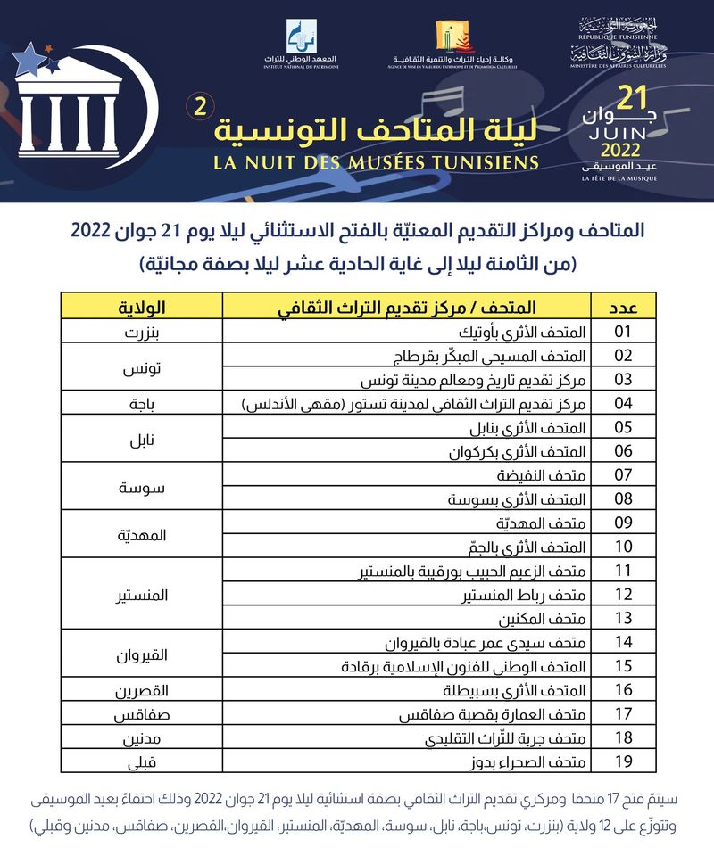 Riche du succès de la première édition, l’Agence de Mise en Valeur du Patrimoine et de Promotion Culturelle organise avec l’Institut National du Patrimoine « la nuit des musées Tunisiens », pour la deuxième fois consécutive, mardi le 21 juin 2022 qui correspond à la fête de la musique et au premier jour de la saison estivale.
